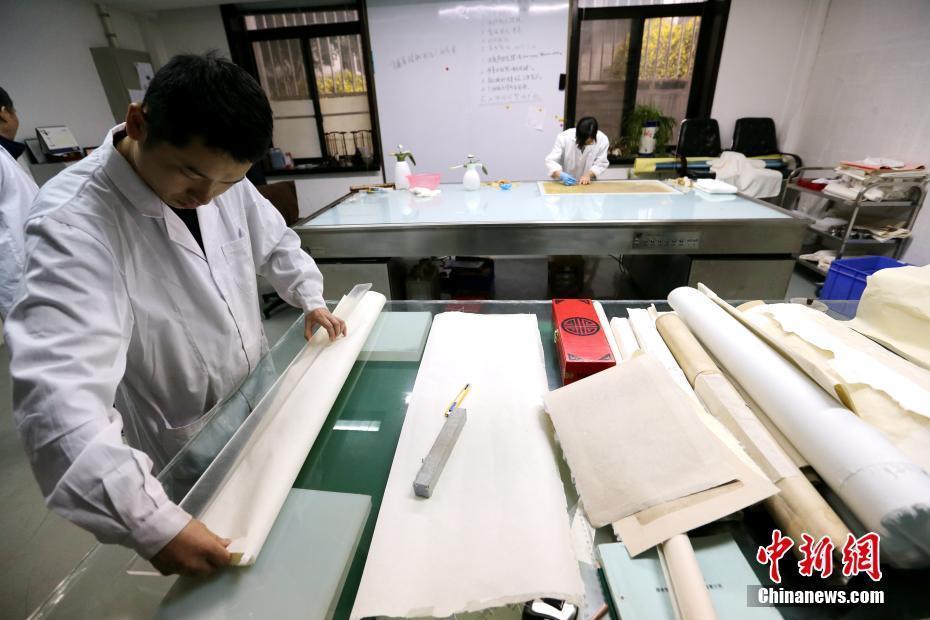 “文物醫(yī)生”在“書畫文物修復(fù)室”內(nèi)工作。中新社記者 張遠(yuǎn) 攝