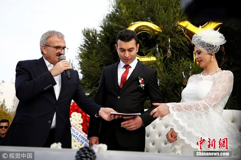當(dāng)?shù)貢r間2018年3月21日,土耳其安塔利亞,警官Ceren Ekici和Taha YasinGul舉行婚禮。在10個月前的一次行動中,Taha YasinGul不慎開槍擊中Ceren Ekici的頭部,所幸沒有造成生命危險(xiǎn)。他們的婚禮由警局同事操辦,同事們舉著防彈盾牌,護(hù)送這對新人走向禮臺。圖片來源:視覺中國