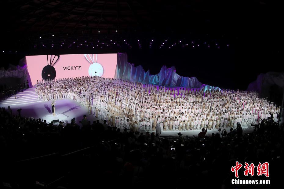 4月1日晚,VICKY’Z·許馨尹時裝發(fā)布會在北京舉行,本季服裝發(fā)布以極光(Aurora)為主題,一千多名小模特登臺表演。中新社記者盛佳鵬 攝