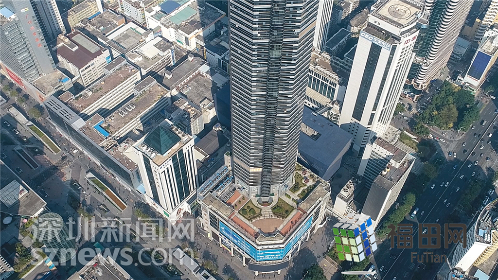 從11樓平臺(tái)花園仰拍賽格廣場(chǎng)大廈。