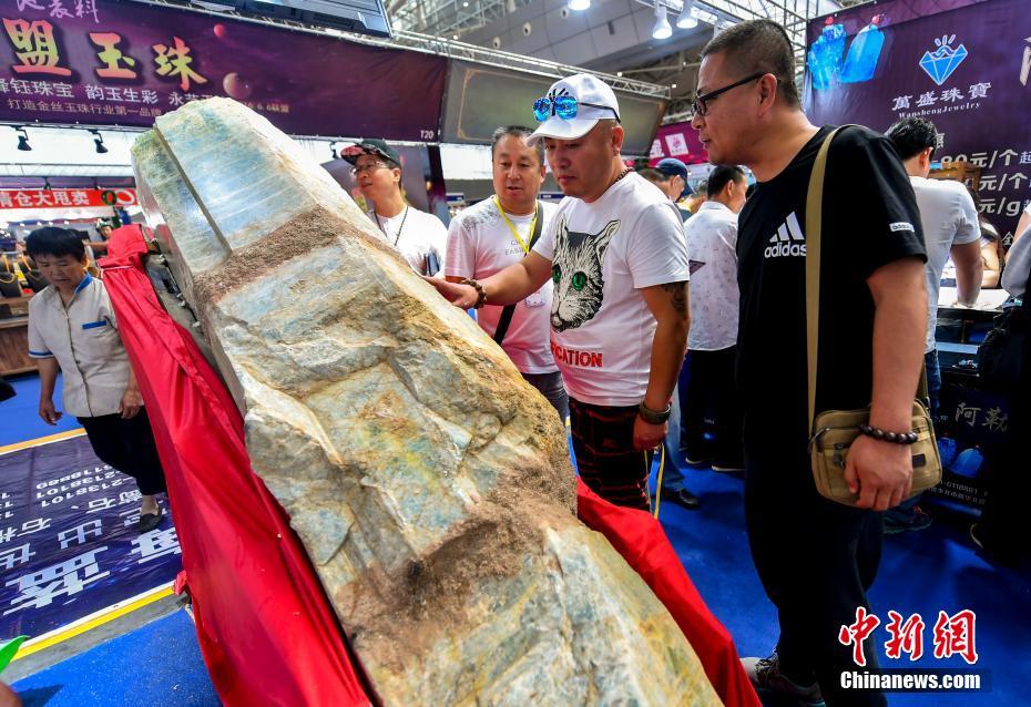 6月15日,第十一屆新疆觀賞石、和田玉精品博覽會(huì)在位于新疆烏魯木齊市紅光山的新疆國(guó)際會(huì)展中心開幕,本次博覽會(huì)參展種類涵蓋珠寶、玉石、礦石、隕石、觀賞石等,吸引眾多奇石玩家到場(chǎng)“以石會(huì)友”,打造獨(dú)具特色的“品石”盛宴。圖為產(chǎn)自新疆阿勒泰地區(qū)富蘊(yùn)縣庫(kù)瑪拉山重量近1噸、價(jià)值1.5億元人民幣的海藍(lán)寶原礦石。中新社記者劉新 攝