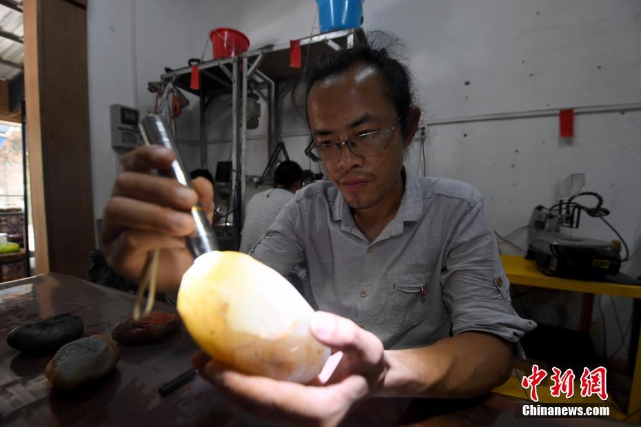 6月20日,廣西南寧市唐人文化街,錢思宇正在審料。1984年的錢思宇出生于湖南懷化,自小喜愛把玩石頭,受父輩影響,從2012年開始從事玉石雕刻工作至今。據(jù)了解,其設(shè)計(jì)的壯鄉(xiāng)玉雕作品,以人物為主,采用廣西當(dāng)?shù)靥赜械氖?,結(jié)合壯文化中的銅鼓、壯錦等元素,通過(guò)刻畫“壯鄉(xiāng)人”的神態(tài),表達(dá)廣西特有的“壯鄉(xiāng)情”。中新社記者 俞靖 攝