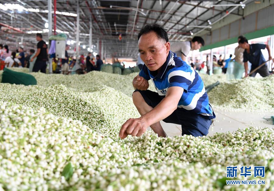 日前,“中國茉莉之鄉(xiāng)”廣西橫縣茉莉花全面進入采摘上市期,當(dāng)?shù)剀岳蚧ǚN植園和交易市場一片繁忙。據(jù)介紹,橫縣茉莉花種植面積達10.5萬畝,花農(nóng)約33萬人,年產(chǎn)茉莉鮮花8.5萬噸,有130多家花茶企業(yè),年產(chǎn)茉莉花茶6.5萬噸。新華社記者陸波岸 攝