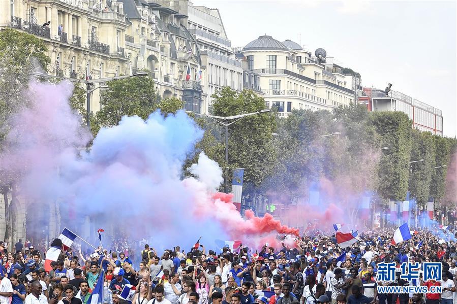 7月15日,法國球迷在巴黎香榭麗舍大街上慶祝法國隊(duì)奪冠。