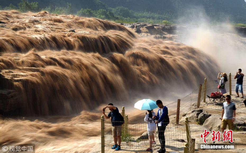 7月17日,山西臨汾,游客在黃河壺口瀑布游覽觀瀑。進(jìn)入7月主汛期,受黃河上游降雨量增多影響,位于山西吉縣和陜西宜川縣交界的黃河壺口瀑布水量暴漲。濁浪滔天的壯美瀑布群景觀,吸引了眾多游客。呂桂明攝 圖片來(lái)源:視覺中國(guó)