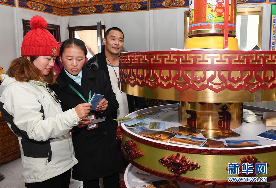 7月24日,天上西藏郵局營業(yè)員措姆(中)為游客介紹特色明信片。