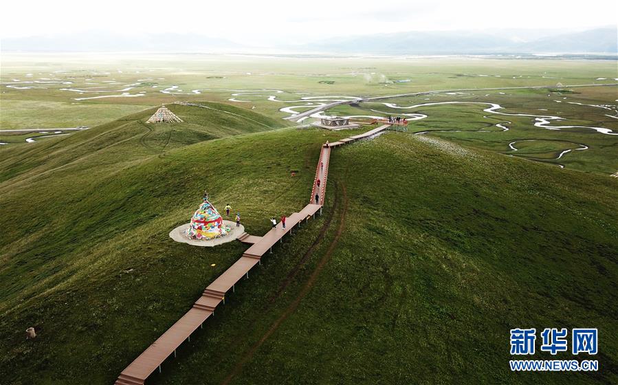 游客在瑪曲縣阿萬倉濕地的觀景步道上游覽(7月31日無人機拍攝)。新華社記者 陳斌 攝