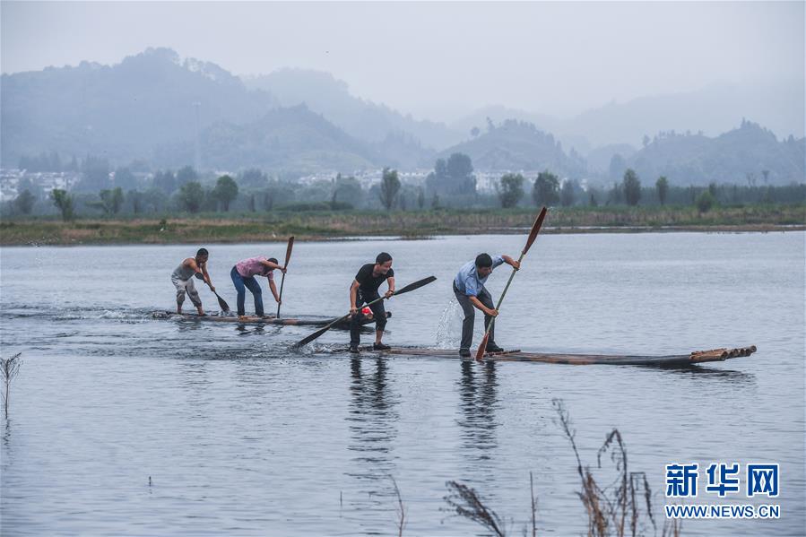 8月2日,淳安縣汾口鎮(zhèn)紅星村的漁民捕撈結(jié)束后,在千島湖的支流武強(qiáng)溪上進(jìn)行劃竹排比賽。 新華社記者 徐昱 攝