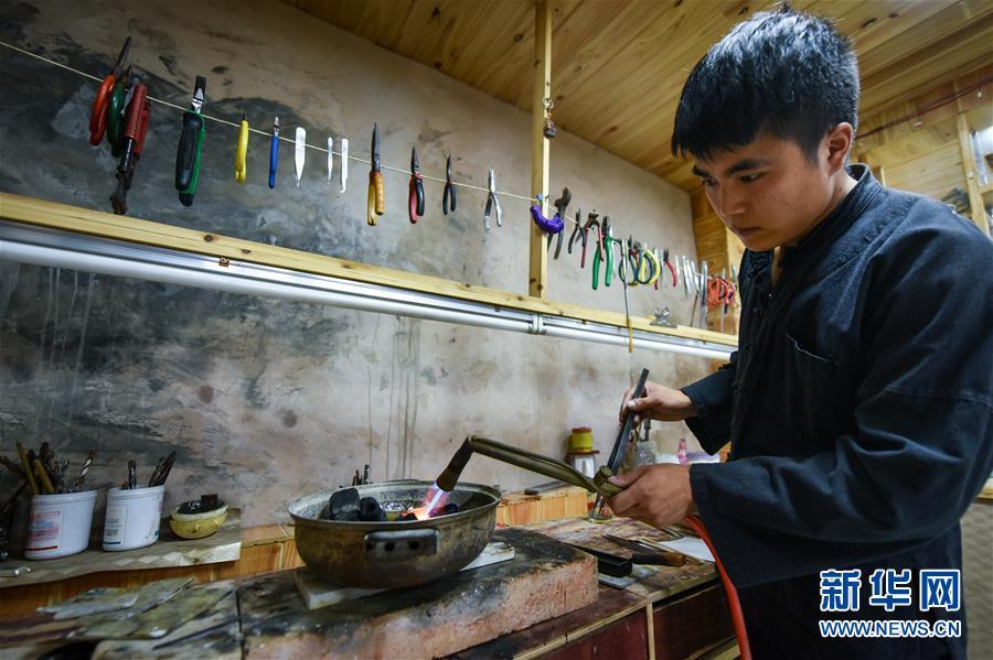 龍懂陽(yáng)的弟弟龍?zhí)?yáng)也是銀飾工藝傳人。和哥哥不同,弟弟主打的是銀飾文化體驗(yàn)游,用自家傳統(tǒng)苗寨開設(shè)民宿,游客在此居住的同時(shí),還能學(xué)習(xí)體驗(yàn)銀飾品制作。每年暑期一到,家長(zhǎng)孩子絡(luò)繹不絕。新客源、新銷路、新模式帶動(dòng)雷山縣銀飾業(yè)不斷發(fā)展壯大,成為脫貧攻堅(jiān)的重要產(chǎn)業(yè)。2017年,雷山縣控拜、麻料、烏高三個(gè)村銀飾品及相關(guān)產(chǎn)業(yè)銷售額超過(guò)1.5億元,吸引很多外出打工的年輕人回家創(chuàng)業(yè)。苗寨鍛銀聲在綠水青山間響遍千戶,也漸漸走出大山,聲名遠(yuǎn)播。新華社記者 李京 攝