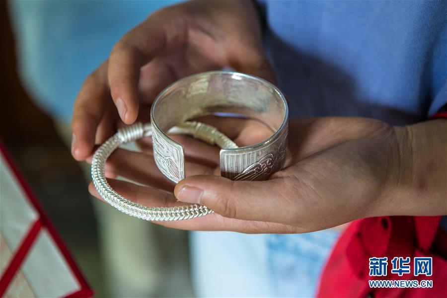 8月3日,唐白梅展示自己在龍懂陽(yáng)的銀飾店里制作的銀鐲子。