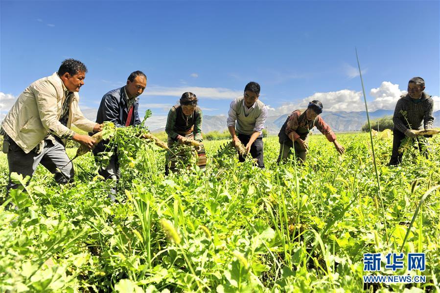 8月8日,在邊雄鄉(xiāng)普夏村蘿卜種植基地,白瑪梅朵合作社工作人員和當?shù)厝罕娨黄鹗斋@蘿卜。 新華社記者 張汝鋒 攝
