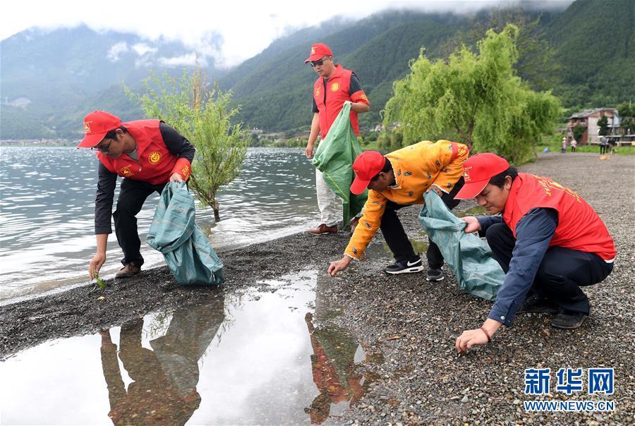 寧蒗永寧鄉(xiāng)落水村的摩梭人次里平措(右二)和幾名村民在瀘沽湖邊撿拾垃圾和雜物(7月31日攝)。 新華社記者 藺以光 攝