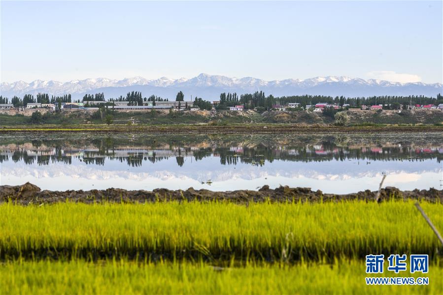 在新疆察布查爾錫伯自治縣種羊場托海依村拍攝的一處農(nóng)田,秧苗與遠處的雪山相映成趣(5月21日攝)。近日,隨著氣溫漸高,地處新疆伊犁河谷的察布查爾錫伯自治縣迎來插秧高峰期,田間地頭一派繁忙景象。塊塊稻田水滿如鏡,田間防護林枝繁葉茂,遠處雪山依稀可見,如一幅在大地上鋪展開的生態(tài)畫卷。新華社記者胡虎虎 攝
