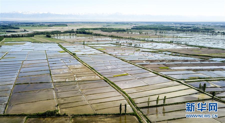 在新疆察布查爾錫伯自治縣扎庫齊牛錄鄉(xiāng)拍攝的一處水稻田(5月21日無人機拍攝)。近日,隨著氣溫漸高,地處新疆伊犁河谷的察布查爾錫伯自治縣迎來插秧高峰期,田間地頭一派繁忙景象。塊塊稻田水滿如鏡,田間防護林枝繁葉茂,遠處雪山依稀可見,如一幅在大地上鋪展開的生態(tài)畫卷。新華社記者胡虎虎 攝