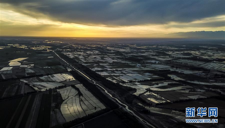 在新疆察布查爾錫伯自治縣種羊場托海依村拍攝的夕陽下的農田(5月21日無人機拍攝)。近日,隨著氣溫漸高,地處新疆伊犁河谷的察布查爾錫伯自治縣迎來插秧高峰期,田間地頭一派繁忙景象。塊塊稻田水滿如鏡,田間防護林枝繁葉茂,遠處雪山依稀可見,如一幅在大地上鋪展開的生態(tài)畫卷。新華社記者胡虎虎 攝
