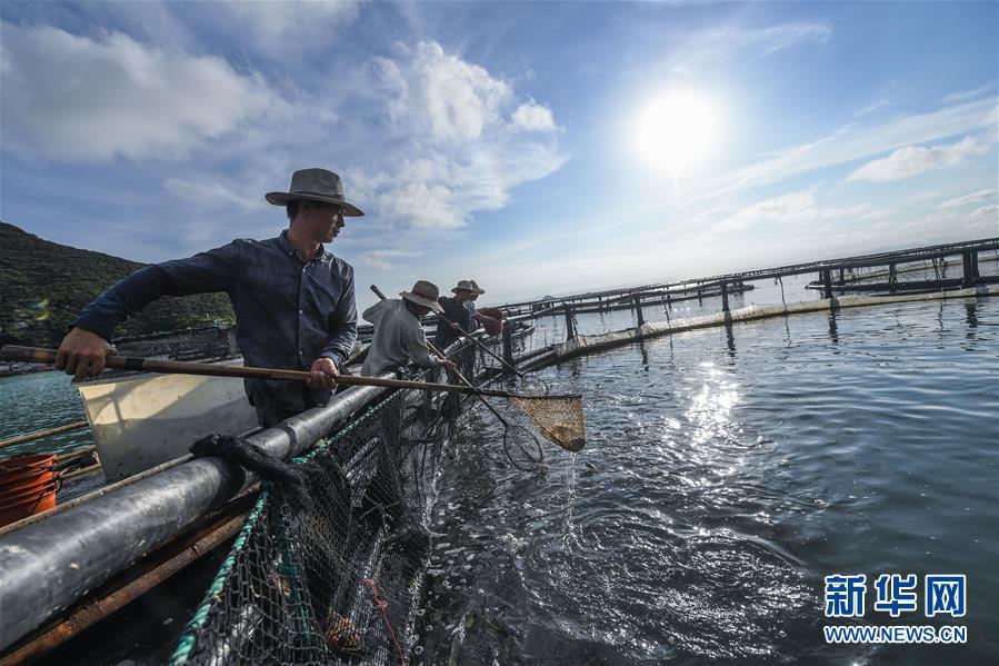 8月18日,南麂島海域的“海上牧場”養(yǎng)殖區(qū)內(nèi),漁民正捕撈大黃魚,處于仿生養(yǎng)殖環(huán)境的大黃魚需要生長2至3年。進入8月,浙江省溫州市平陽縣南麂鎮(zhèn)海域上大片的大黃魚、貽貝等特色海產(chǎn)品養(yǎng)殖區(qū)域迎來豐收季節(jié),養(yǎng)殖戶們駕駛漁船在養(yǎng)殖區(qū)海域進行打撈收獲,在碧海藍天下構(gòu)成了一幅“海上牧場”的美麗豐收景象。近年來,南麂鎮(zhèn)政府引導漁民養(yǎng)殖戶充分發(fā)揮“靠海吃?!钡馁Y源優(yōu)勢,大力發(fā)展海洋養(yǎng)殖經(jīng)濟和海島旅游經(jīng)濟,實現(xiàn)了南麂由“生態(tài)美”向“產(chǎn)業(yè)美”,“產(chǎn)業(yè)美”向“經(jīng)濟美”的轉(zhuǎn)變。同時該鎮(zhèn)堅持以大黃魚、貽貝等為特色產(chǎn)業(yè)支撐,精準發(fā)展高效海洋養(yǎng)殖業(yè),重點培養(yǎng)一批新型職業(yè)漁民,依靠專業(yè)技術(shù)支持,實現(xiàn)深海仿生養(yǎng)殖,讓好生態(tài)造就好品質(zhì),重點打造南麂養(yǎng)殖品牌,組建營銷網(wǎng)絡,拓展特色海產(chǎn)品市場。新華社記者 徐昱攝
