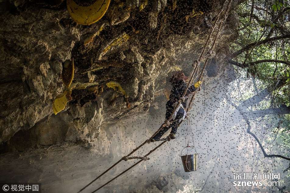?“最難采摘的崖蜜,是凹進懸崖內(nèi)側(cè)3至5米的那種?!眱赡陙恚∪镉H自跟采了十幾趟蜜,最怕遇到凹陷的蜜源。