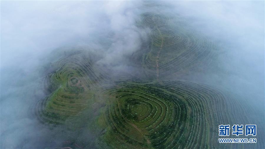 云霧繚繞的寧夏彭陽縣金雞坪梯田公園(7月17日無人機拍攝)。 新華社記者 王鵬 攝