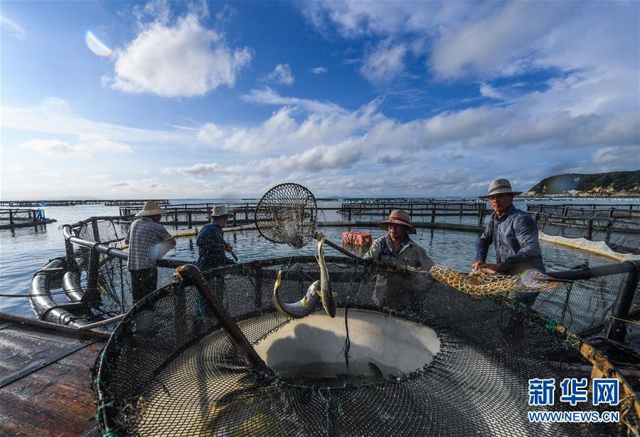 8月18日,南麂島海域內(nèi)的“海上牧場”養(yǎng)殖區(qū)內(nèi),漁民正捕撈大黃魚,處于仿生養(yǎng)殖環(huán)境的大黃魚需要生長2至3年。進(jìn)入8月,浙江省溫州市平陽縣南麂鎮(zhèn)海域上大片的大黃魚、貽貝等特色海產(chǎn)品養(yǎng)殖區(qū)域迎來豐收季節(jié),養(yǎng)殖戶們駕駛漁船在養(yǎng)殖區(qū)海域進(jìn)行打撈收獲,在碧海藍(lán)天下構(gòu)成了一幅“海上牧場”的美麗豐收景象。近年來,南麂鎮(zhèn)政府引導(dǎo)漁民養(yǎng)殖戶充分發(fā)揮“靠海吃?!钡馁Y源優(yōu)勢,大力發(fā)展海洋養(yǎng)殖經(jīng)濟(jì)和海島旅游經(jīng)濟(jì),實(shí)現(xiàn)了南麂由“生態(tài)美”向“產(chǎn)業(yè)美”,“產(chǎn)業(yè)美”向“經(jīng)濟(jì)美”的轉(zhuǎn)變。同時(shí)該鎮(zhèn)堅(jiān)持以大黃魚、貽貝等為特色產(chǎn)業(yè)支撐,精準(zhǔn)發(fā)展高效海洋養(yǎng)殖業(yè),重點(diǎn)培養(yǎng)一批新型職業(yè)漁民,依靠專業(yè)技術(shù)支持,實(shí)現(xiàn)深海仿生養(yǎng)殖,讓好生態(tài)造就好品質(zhì),重點(diǎn)打造南麂養(yǎng)殖品牌,組建營銷網(wǎng)絡(luò),拓展特色海產(chǎn)品市場。新華社記者 徐昱攝