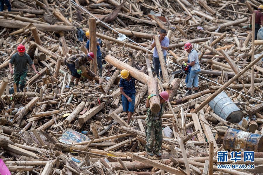 9月4日,當?shù)厝罕娫诼槔跗驴h猛硐瑤族鄉(xiāng)壩子橋區(qū)域清理河道內堆積的木材。當日,云南麻栗坡山洪泥石流災害救援工作繼續(xù)開展,救援人員在現(xiàn)場全力搜尋失蹤人員。新華社發(fā)方超 攝 圖片來源:新華網(wǎng)