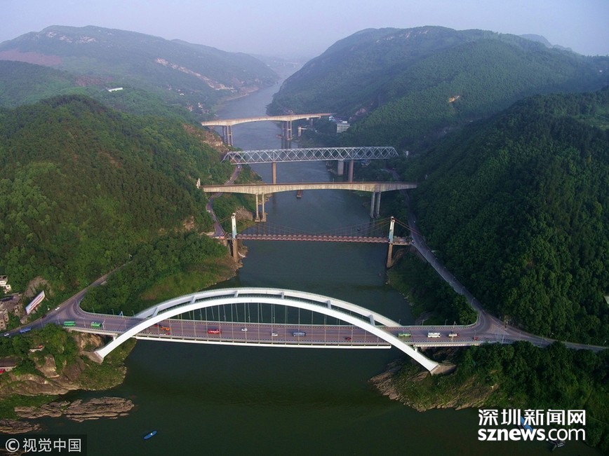 ??? 2018年5月18日,重慶,在嘉陵江重慶觀音峽段,間隔不到1000米的江面上橫跨著五座大橋,形成了五橋“疊翠”的美麗景觀,生動展示了“橋都”重慶的變化。