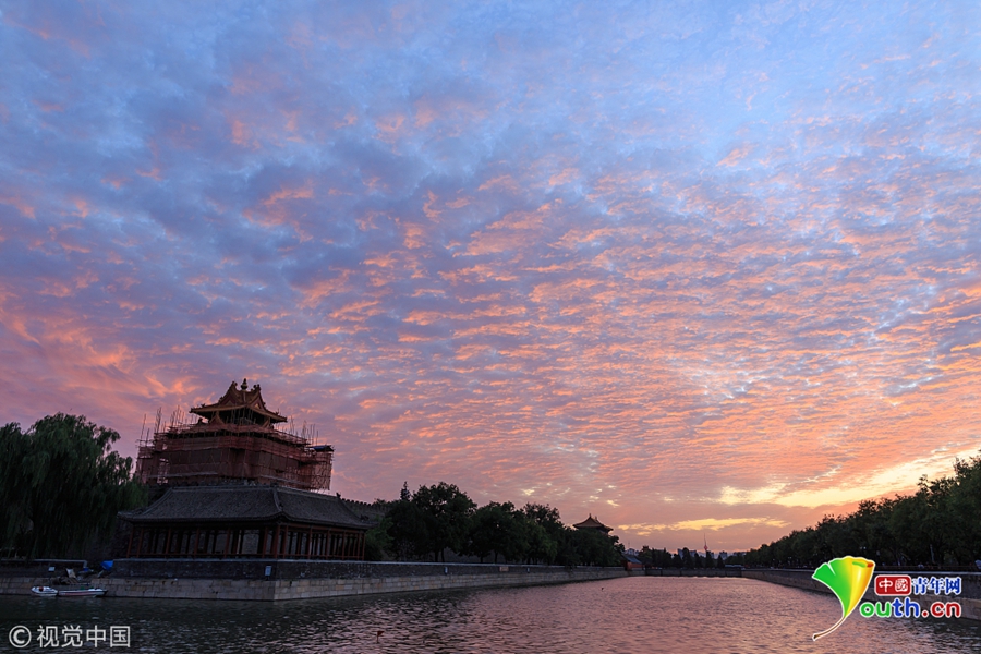 2018年9月5日,北京迎晴好天氣,傍晚時分,落日晚霞美不勝收。天空出現美麗的火燒云,映照故宮博物院角樓。圖片來源:視覺中國