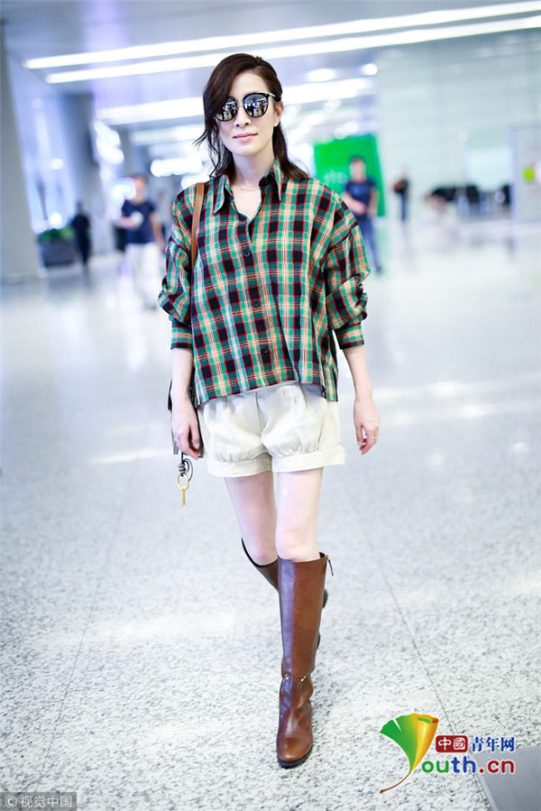 2018年9月9日,“嫻妃”佘詩曼從上海機(jī)場(chǎng)飛往北京機(jī)場(chǎng),她擺“剪刀腿”大方任拍,身穿格紋襯搭配衫燈籠褲,時(shí)髦青春衣品超贊!