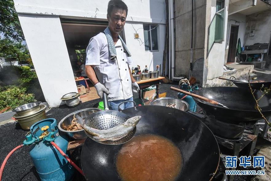 9月18日,村民在烹飪剛剛捕撈上來的江鮮。