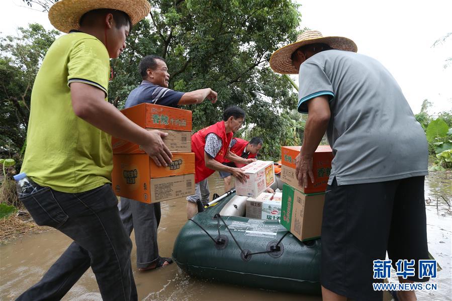 9月18日,在廣東省陽江市陽春市,人們把食物搬運到筏子上,準備分發(fā)給受困村民。  新華社記者張加揚攝