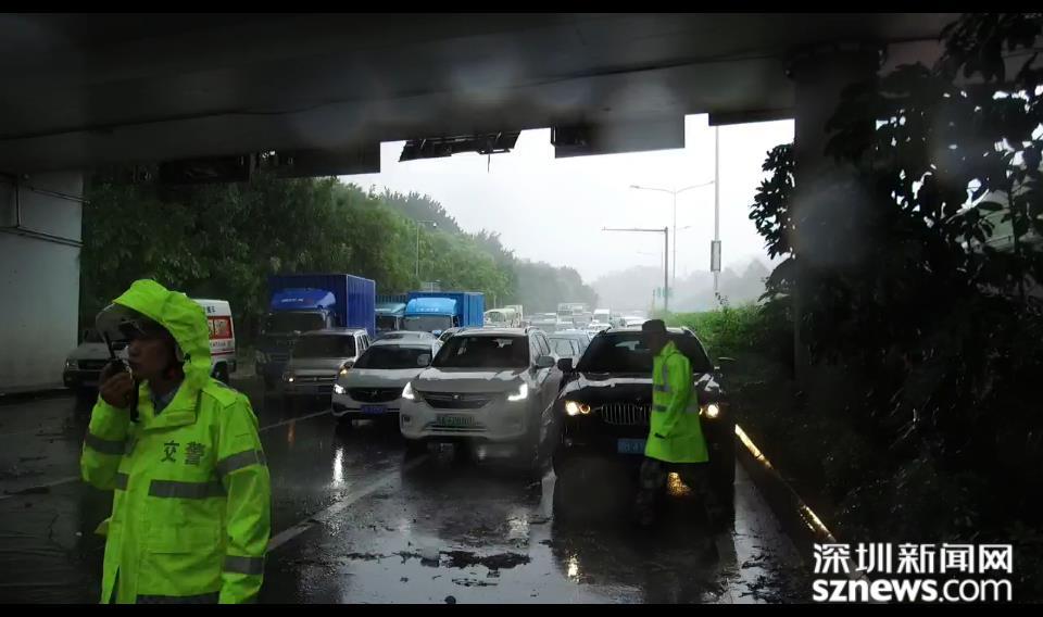 福田區(qū)位于北環(huán)皇崗立交,深圳市水務(wù)集團(tuán)福田分公司梅林所防洪排澇人員,趁風(fēng)勢雨小,打開雨水箅子排積水。