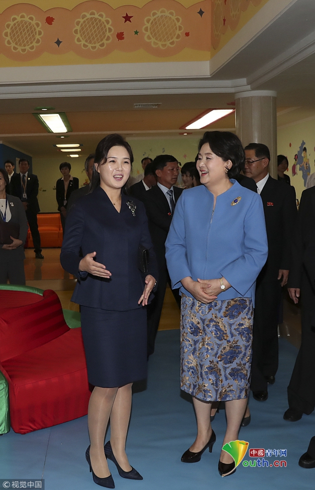 當?shù)貢r間2018年9月18日,朝鮮平壤,韓國總統(tǒng)文在寅夫人金正淑在朝鮮國務委員會委員長金正恩夫人李雪主的陪同下參觀平壤金元均音樂大學。圖片作者:視覺中國