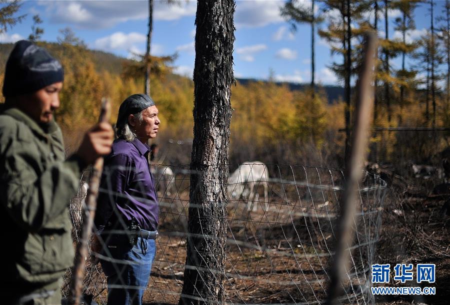 9月18日,在內(nèi)蒙古大興安嶺根河林業(yè)局約安里林場,根河市敖魯古雅鄉(xiāng)獸醫(yī)站站長古革軍(右)在鹿圈查看馴鹿。新華社記者于洋攝