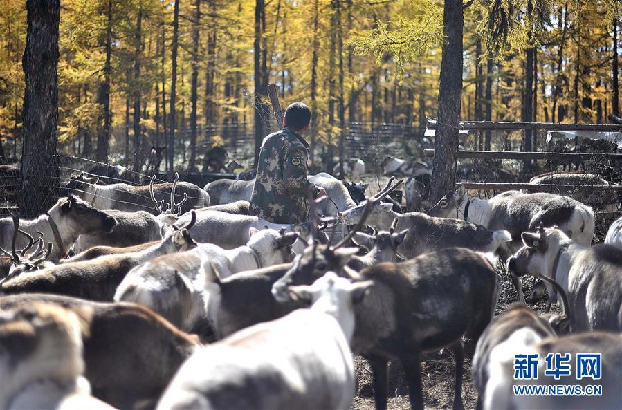 9月18日,在內(nèi)蒙古大興安嶺根河林業(yè)局約安里林場,林場職工張國華要為馴鹿補充飼料。