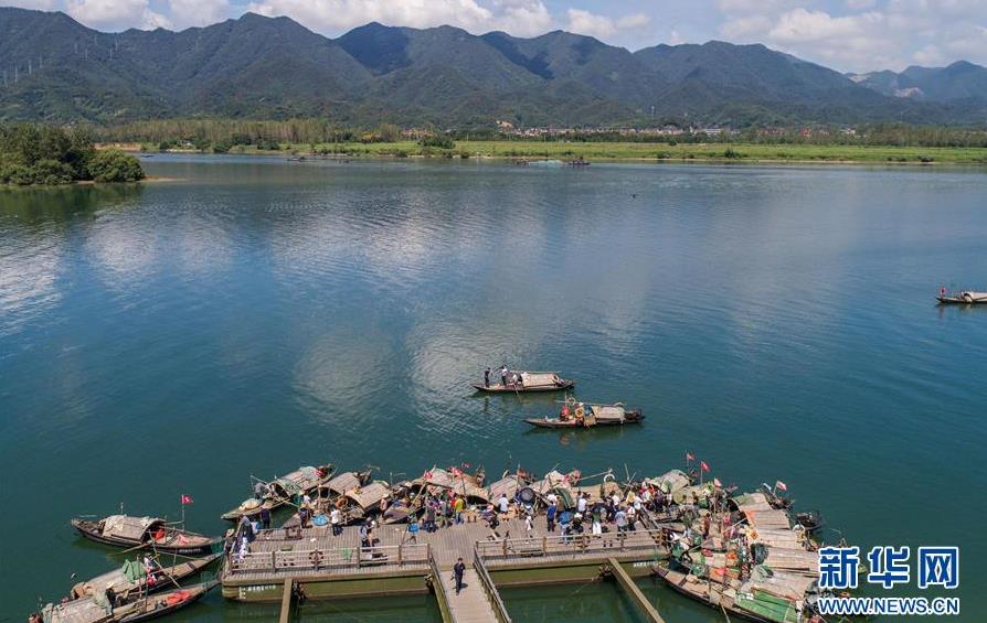 9月18日,漁船陸續(xù)從碼頭出發(fā),行駛到富春江里捕撈江鮮(無(wú)人機(jī)拍攝)。