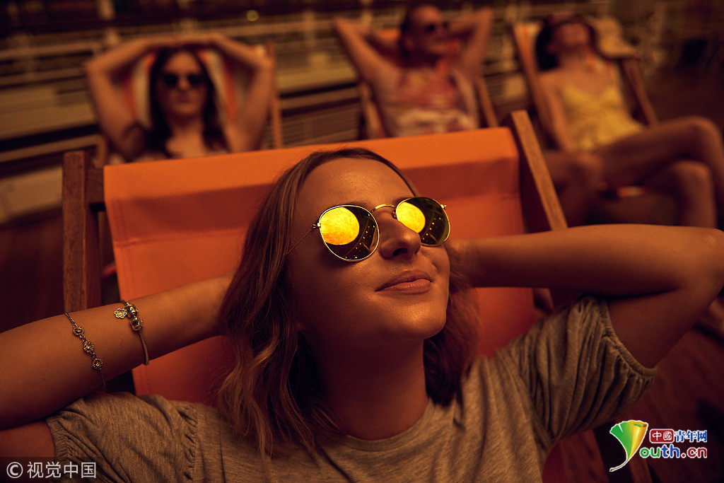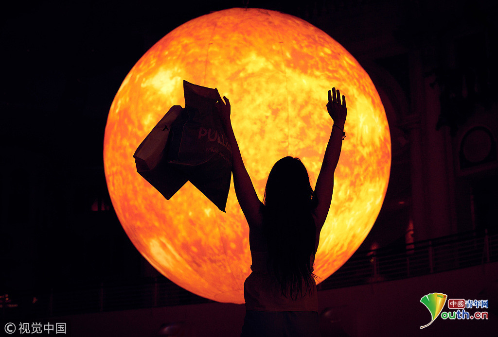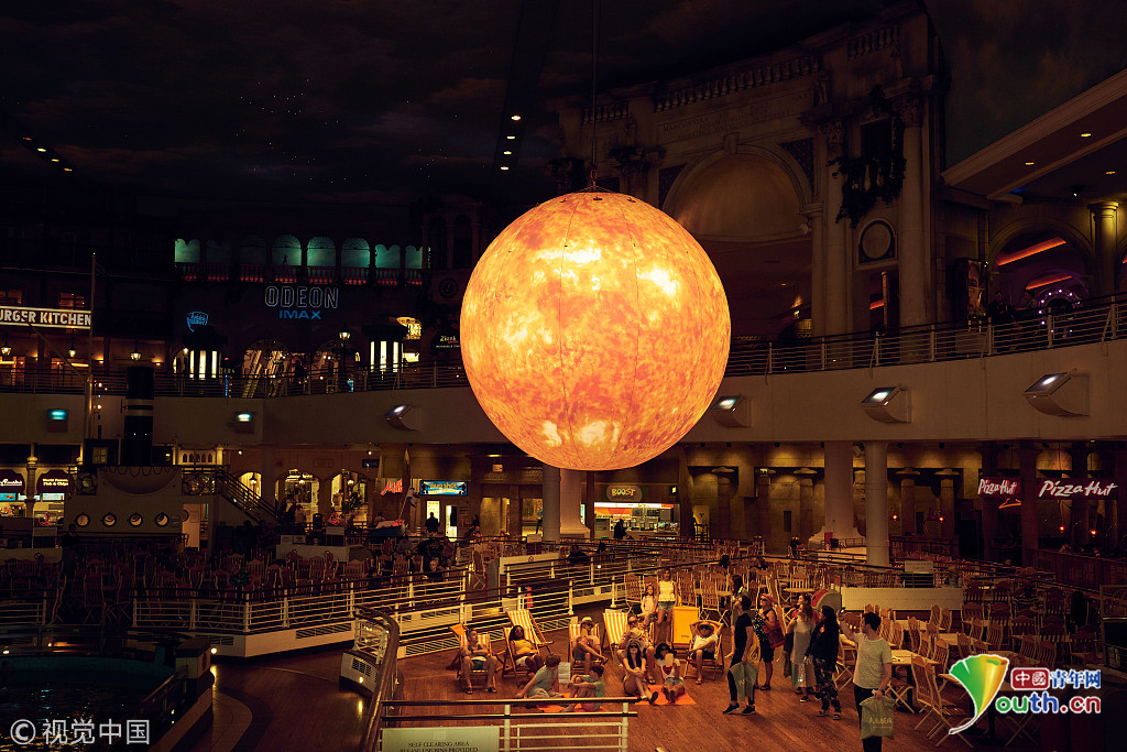 當?shù)貢r間2018年9月18日,英國曼切斯特,顧客們在特拉福德購物中心的一個巨型的“太陽”下享受室內(nèi)日光浴,感受英國未完的史上最熱夏天。這個人造“太陽”的亮度相當于1.2萬個燈泡。圖片來源:視覺中國