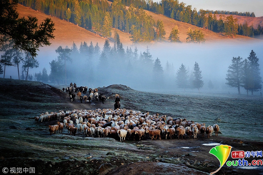 族牧民整理好行裹,抱著孩子,趕著牛羊,浩浩蕩蕩向秋牧場遷徙。