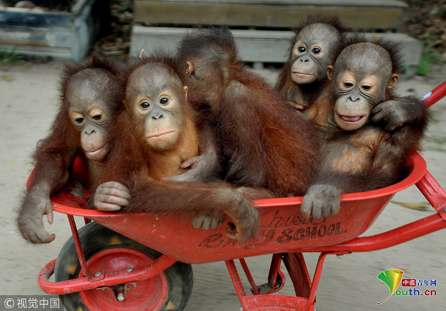 印尼動物救援中心里 猩猩寶寶擠“校車”“上學”超萌