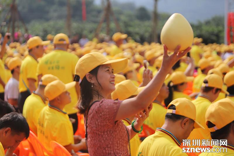 慶祝首屆“中國農(nóng)民豐收節(jié)”活動在梅州大黃村舉行,活動期間一名觀眾舉起柚子準(zhǔn)備拍照。
