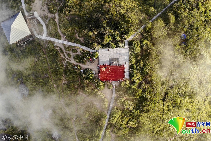 9月26日,長三角第一高峰浙江龍泉山農(nóng)作物喜獲豐收,當(dāng)?shù)剞r(nóng)民與游客用8噸剛收獲的辣椒以及玉米,在山頂?shù)脑坪V衅闯隽艘幻骈L10米、寬6.6米的巨型國旗慶祝豐收。