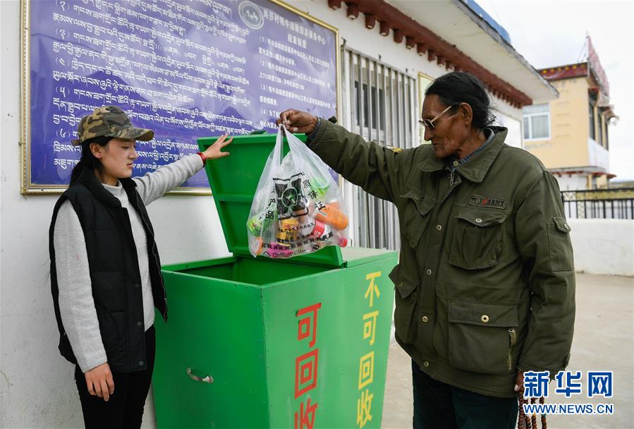 西藏阿里地區(qū)普蘭縣巴嘎鄉(xiāng)居民(右)在“垃圾銀行”兌換點(diǎn)工作人員指引下,將垃圾丟入分類箱中(9月13日攝)。 生活垃圾1袋可兌換胸牌1個(gè),2袋可兌換鑰匙扣1個(gè),可回收垃圾1袋可兌換抽紙1包或濕巾1袋……近日,記者在西藏阿里地區(qū)普蘭縣巴嘎鄉(xiāng)神山圣湖景區(qū)看到,一些游客領(lǐng)取環(huán)保袋在景區(qū)內(nèi)撿垃圾后,拿去兌換西藏特色紀(jì)念品。 這一切,得益于當(dāng)?shù)亻_(kāi)設(shè)的“垃圾銀行”。今年6月,巴嘎鄉(xiāng)在神山圣湖景區(qū)開(kāi)設(shè)“垃圾銀行”,鼓勵(lì)游客和群眾拾撿垃圾兌換獎(jiǎng)品,破解景區(qū)垃圾收運(yùn)難題,取得良好效果。 新華社記者劉東君攝