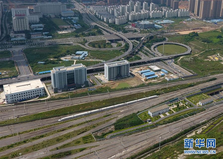 一列動(dòng)車在南寧市區(qū)行駛(9月4日無人機(jī)拍攝)。 廣西壯族自治區(qū)成立60年來,鐵路建設(shè)發(fā)生翻天覆地的變化。來自中國鐵路南寧局集團(tuán)有限公司的數(shù)據(jù)顯示,1958年廣西鐵路總里程為1346.3公里,如今廣西鐵路總里程達(dá)5191公里。廣西與周邊相鄰省份間實(shí)現(xiàn)動(dòng)車“公交化”開行。此外,北部灣港—重慶班列、東盟海產(chǎn)品冷鏈班列、“百色一號”果蔬專列等的開通和運(yùn)營,強(qiáng)化了鐵路供給的針對性和有效性。鐵路成為助推廣西經(jīng)濟(jì)社會快速發(fā)展的“大動(dòng)脈”。 新華社記者陸波岸攝
