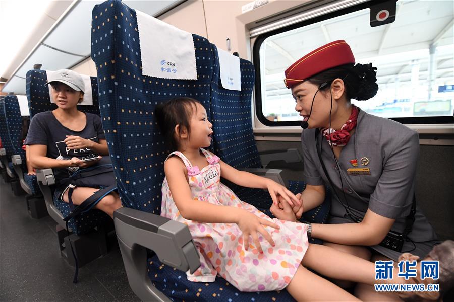 在南寧東站,一名列車工作人員在和一名小朋友交流(2017年8月5日攝)。 廣西壯族自治區(qū)成立60年來,鐵路建設發(fā)生翻天覆地的變化。來自中國鐵路南寧局集團有限公司的數(shù)據(jù)顯示,1958年廣西鐵路總里程為1346.3公里,如今廣西鐵路總里程達5191公里。廣西與周邊相鄰省份間實現(xiàn)動車“公交化”開行。此外,北部灣港—重慶班列、東盟海產品冷鏈班列、“百色一號”果蔬專列等的開通和運營,強化了鐵路供給的針對性和有效性。鐵路成為助推廣西經(jīng)濟社會快速發(fā)展的“大動脈”。 新華社記者陸波岸攝