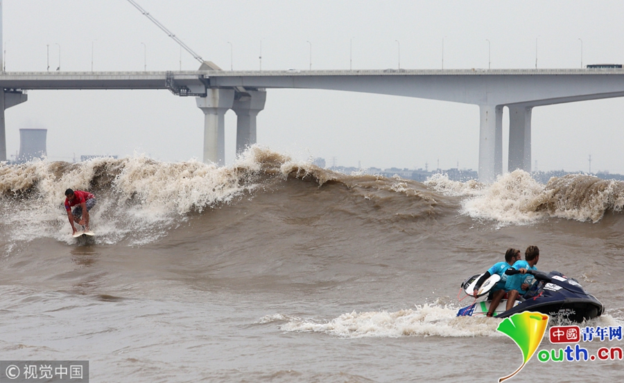 杭州錢江江面上,沖浪弄潮兒英姿颯爽。