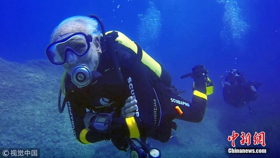 當(dāng)?shù)貢r(shí)間2018年9月1日,塞浦路斯,95歲的英國(guó)潛水員雷·伍利(Ray Woolley)以44分鐘下潛40.5米的成績(jī)打破了自己94歲達(dá)成的記錄(41分鐘下潛38.1米),二度刷新了世界上年齡最大的男性潛水員最好成績(jī)。在此次下潛中,這位二戰(zhàn)退伍老兵對(duì)距塞浦路斯南部城鎮(zhèn)拉納卡約2公里處的海域進(jìn)行了探索,1980年一艘名為“芝諾比亞號(hào)”(Zenobia)的貨船在這里進(jìn)行首次航行時(shí)沉沒(méi)。圖片來(lái)源:視覺(jué)中國(guó)