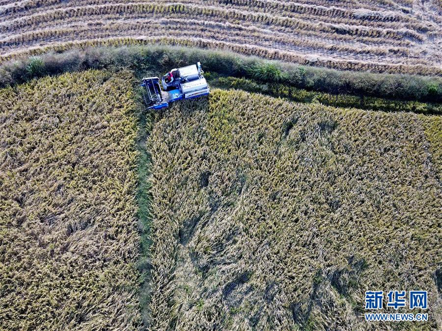 9月27日,在鳳陽縣小崗村,農(nóng)民駕駛收割機(jī)收割水稻(無人機(jī)拍攝)。新華社記者 劉軍喜 攝