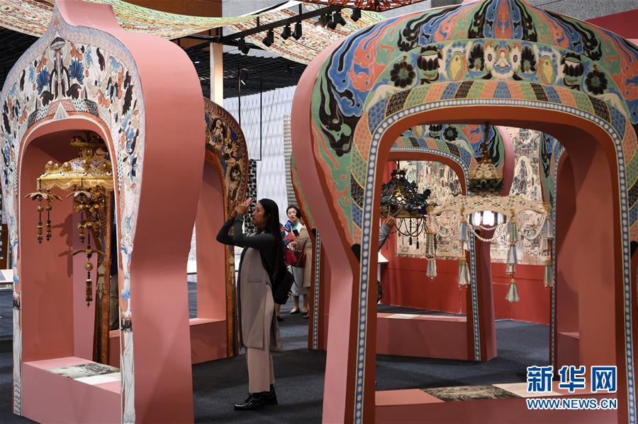 9月27日,在敦煌國(guó)際會(huì)展中心,參觀者欣賞展出的藝術(shù)品。 新華社記者范培珅攝