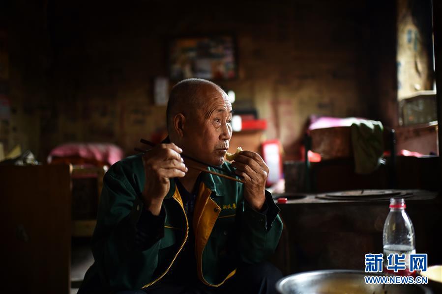 在黃崖洞烈士陵園,趙乃堂在屋里吃午飯(9月18日攝)。 新華社記者 詹彥 攝
