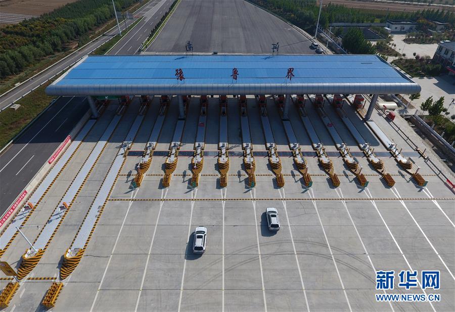 9月28日,車輛準(zhǔn)備通過河南省南樂縣的南(樂)林(州)高速豫魯界收費站(無人機拍攝)。新華社記者 馮大鵬 攝