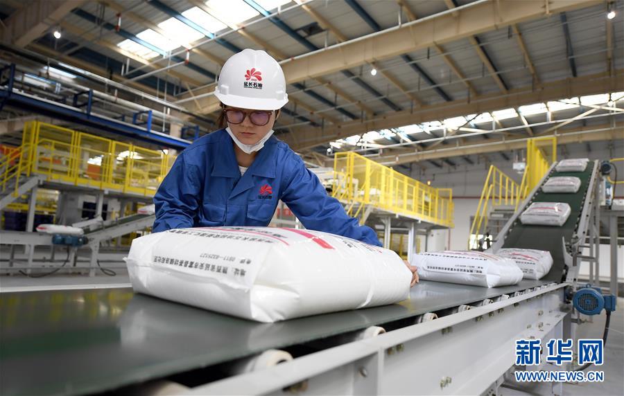 延安煤油氣資源綜合利用項目包裝車間的工作人員進行產(chǎn)品包裝檢查(9月28日攝)。新華社記者劉瀟攝