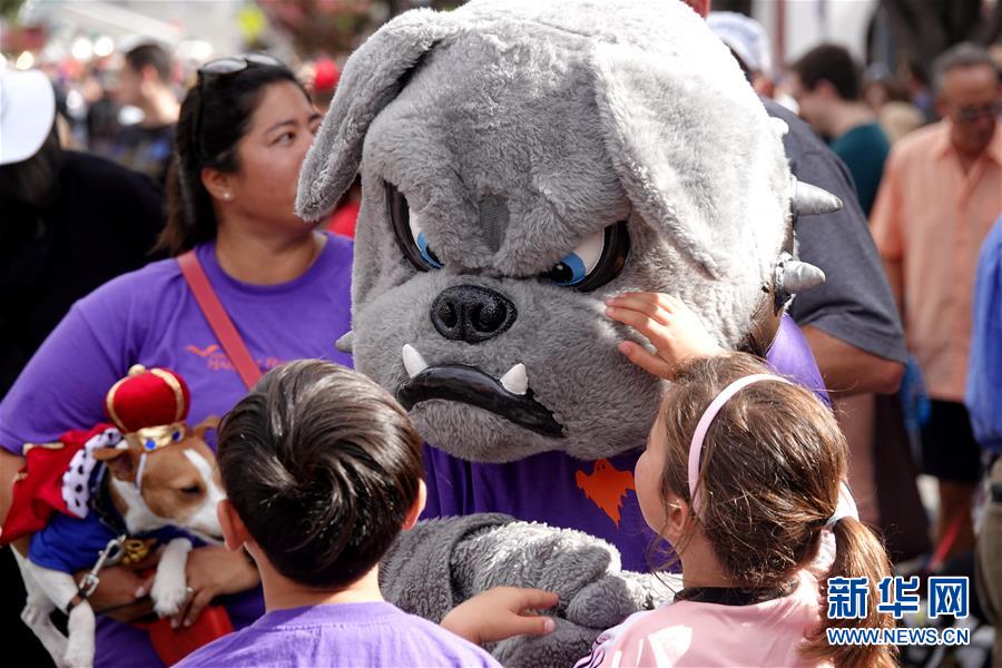 9月29日,在美國加利福尼亞州伯林蓋姆市,兒童參加寵物狗大游行活動(dòng)時(shí)與卡通人偶互動(dòng)。美國加州舊金山灣區(qū)的伯林蓋姆市29日舉行寵物狗大游行活動(dòng)。新華社記者吳曉凌攝